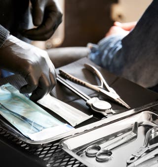 - “Bär din piercare latexhandskar? De bör alltid bära handskar och sanera arbetsstationen efter varje kund. Om jag vidrör saker utanför det steriliserade området byter jag handskar."