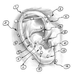 - Orbital – Två hål i brosket som har ett gemensamt smycke, vanligtvis i helix-området