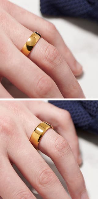 Bara för att ringen glider på ditt finger innebär inte att det är rätt storlek. Om vigselringen är för stor kan den glida av fingret när du tvättar händerna. Om det är för litet kan det skära av eller skada blodcirkulationen.