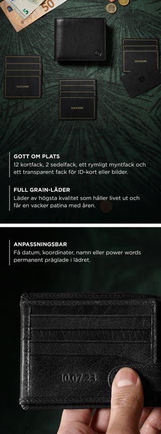 - Plats för upp till 20 kort, sedlar och kvitton