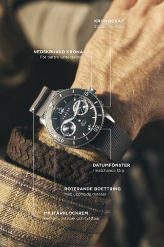 - Kirurgiskt stål och safirglas med dubbel kupol